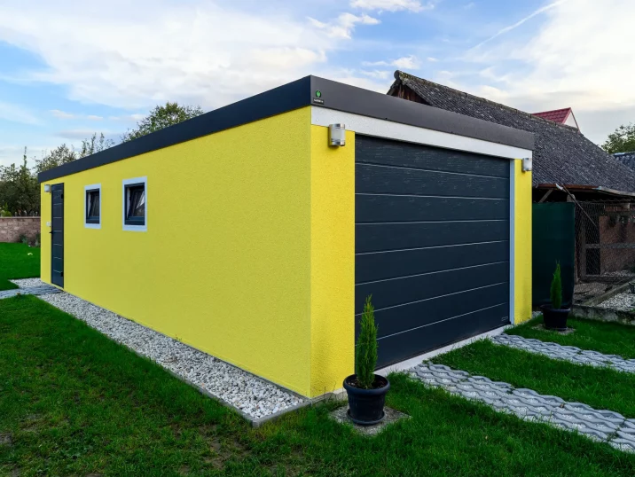Achten Sie darauf, für Ihre Fertigteilgarage eine Verputzfarbe zu wählen, die gut zur Umgebung passt. Schlichte Farben etwa passen am besten zu modernen Bauwerken, während ältere Gebäude oft etwas bunter sind. Den meisten Einfluss hat aber die Farbe Ihres Hauses, das wahrscheinlich unmittelbar neben Ihrer Garage stehen wird.